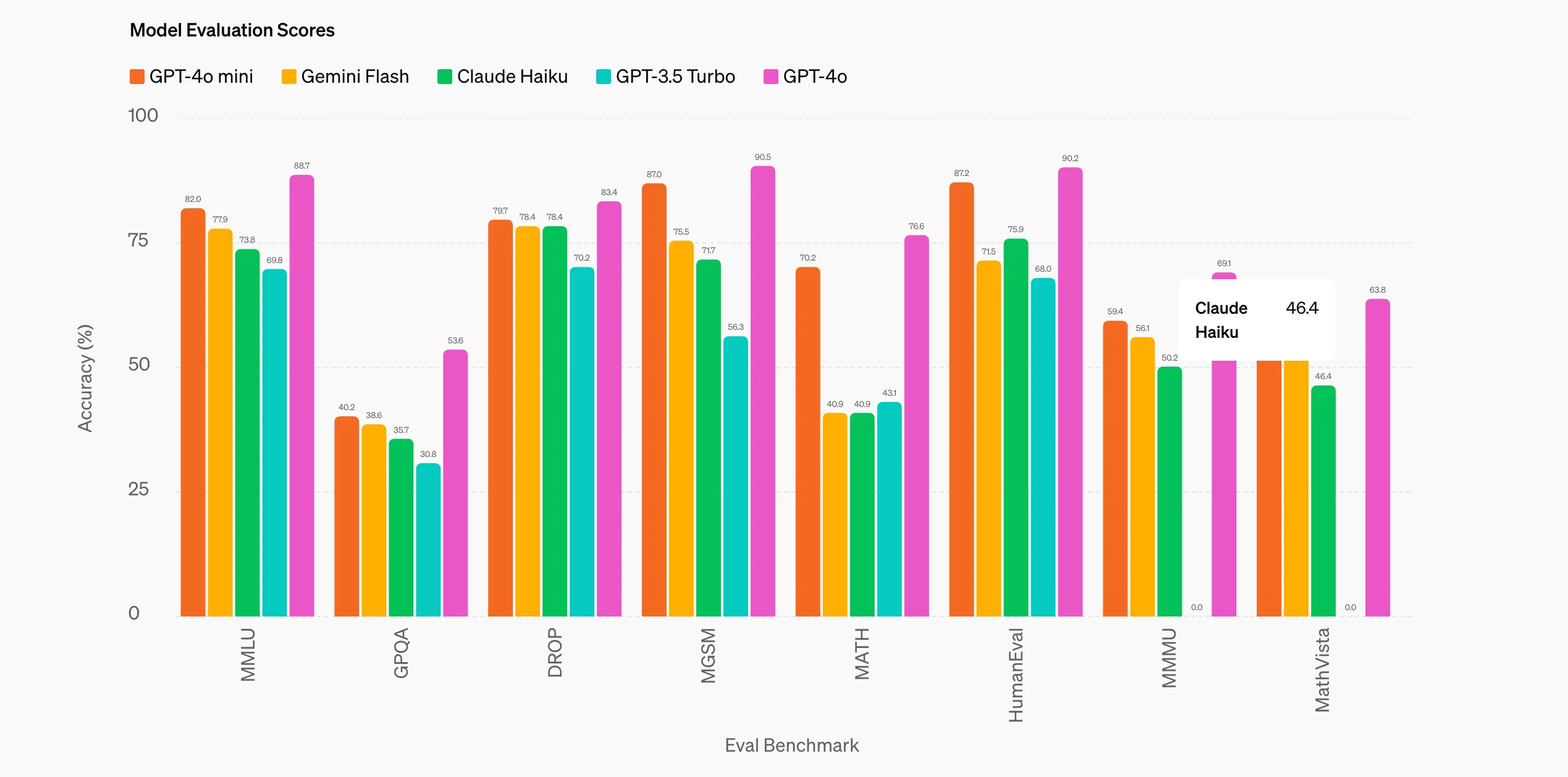 GPT-4o Mini scores an impressive 82% on the MMLU benchmark. This benchmark is designed to assess a model's ability to understand and reason across a wide range of academic subjects. In this context, GPT-4o Mini outperforms other small models, particularly in tasks that involve complex reasoning and understanding of both text and visual inputs. This high score indicates that GPT-4o Mini excels in interpreting and generating human-like responses across diverse topics. - MMMU (Multimodal Massive Multitask Understanding) Benchmark: