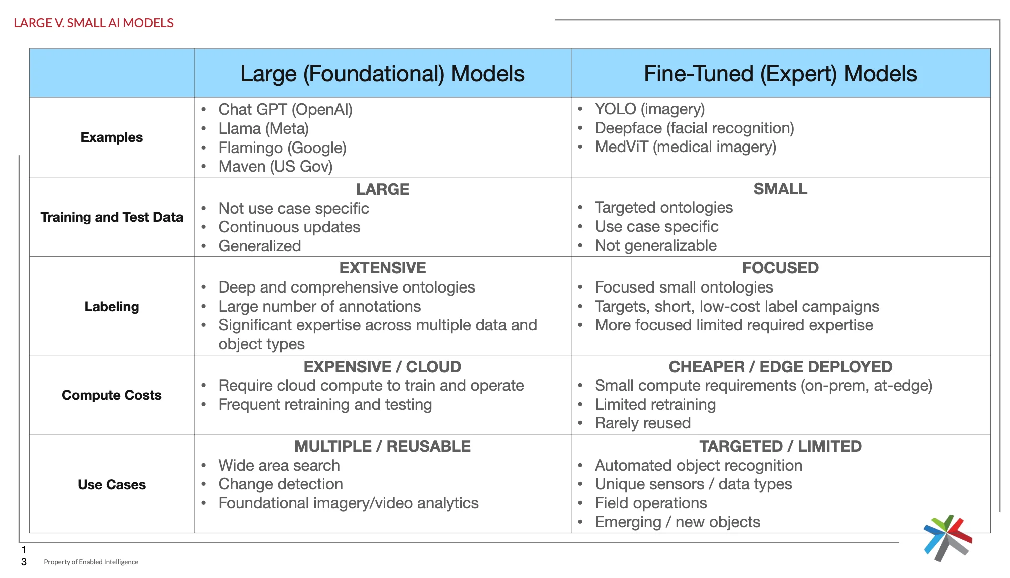 Fine-Tuned Expert Models focus on specific object types or use cases with targeted ontologies. They require smaller, more focused datasets but offer advantages in edge deployment scenarios and specialized applications like automated object recognition for unique sensors.