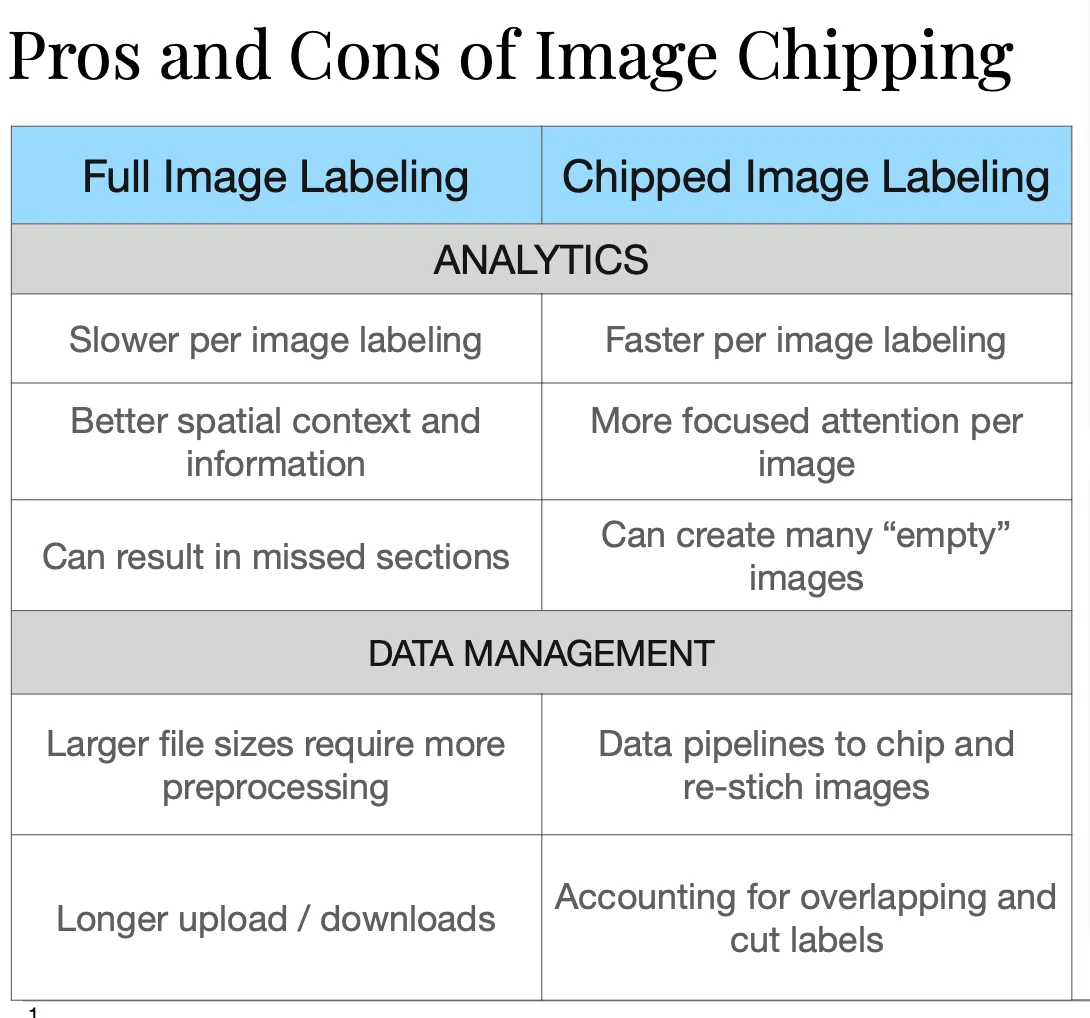 Image Chipping: Dividing large images into smaller tiles enables faster per-image labeling and more focused attention on individual objects. However, the loss of spatial context creates significant challenges for human annotators.