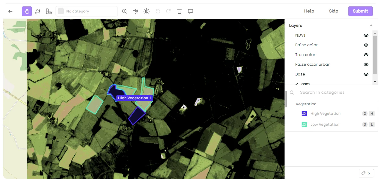 One of the most powerful but challenging aspects of Earth Observation data is its multi-spectral nature. Unlike standard RGB photography, satellite sensors capture information across numerous wavelength bands, including those outside the visible spectrum. Working with multi-spectral imagery presents significant challenges for annotation workflows, as annotators must be able to view and switch between different spectral bands to identify features that may be apparent in one wavelength but not in others.