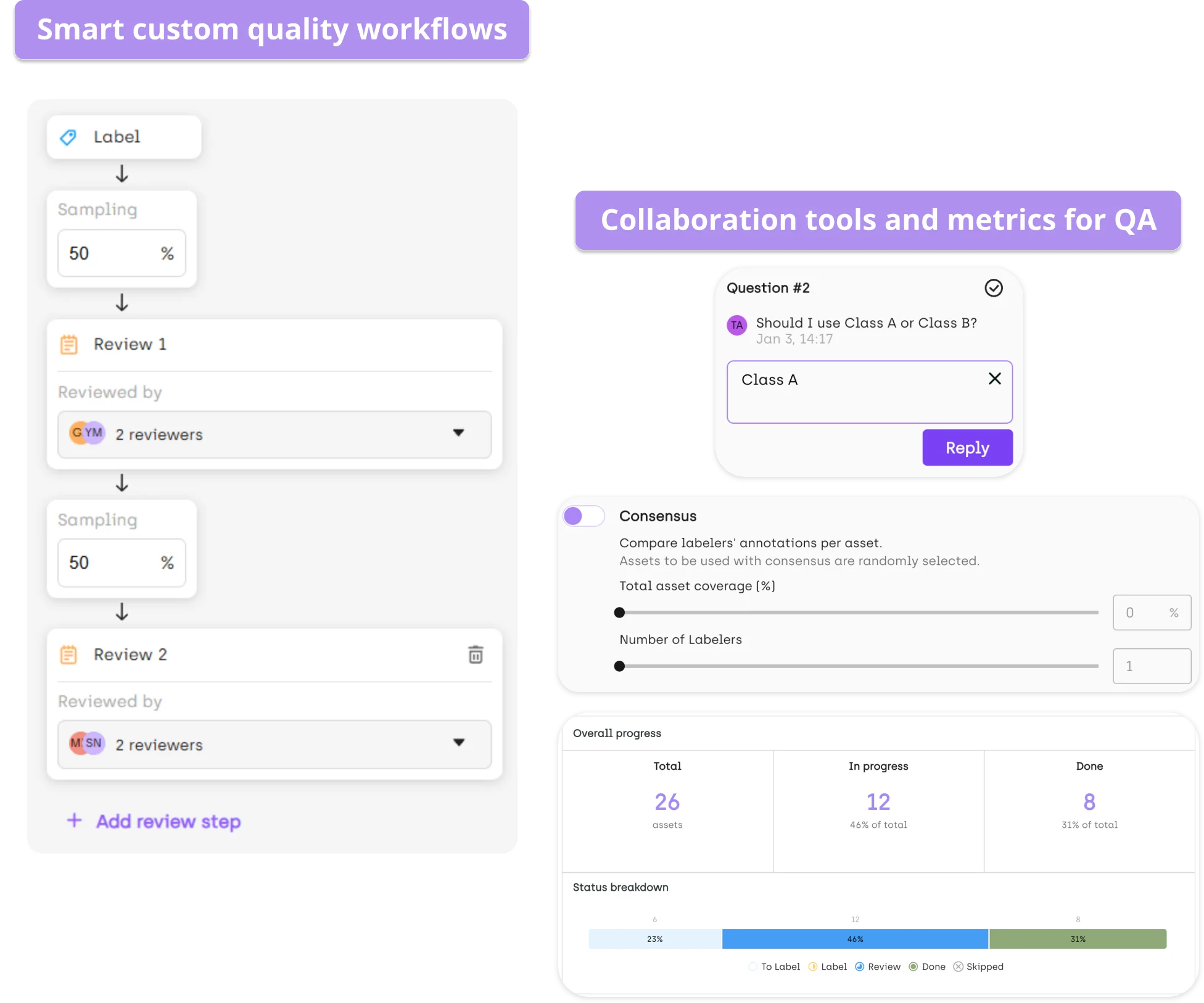Specialized platforms implement honeypot and consensus features to measure annotator performance, programmatic quality assurance workflows through API access, advanced filtering for focused reviews, and comprehensive metrics tracking both quality and productivity to provide valuable insights into the annotation process.