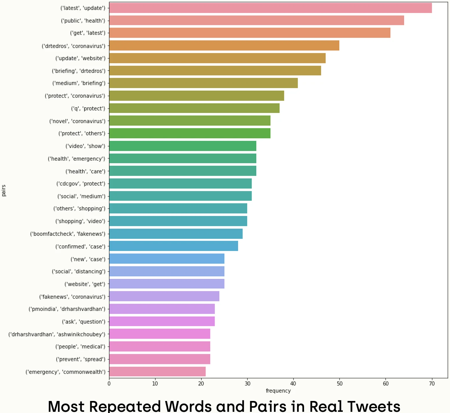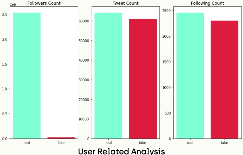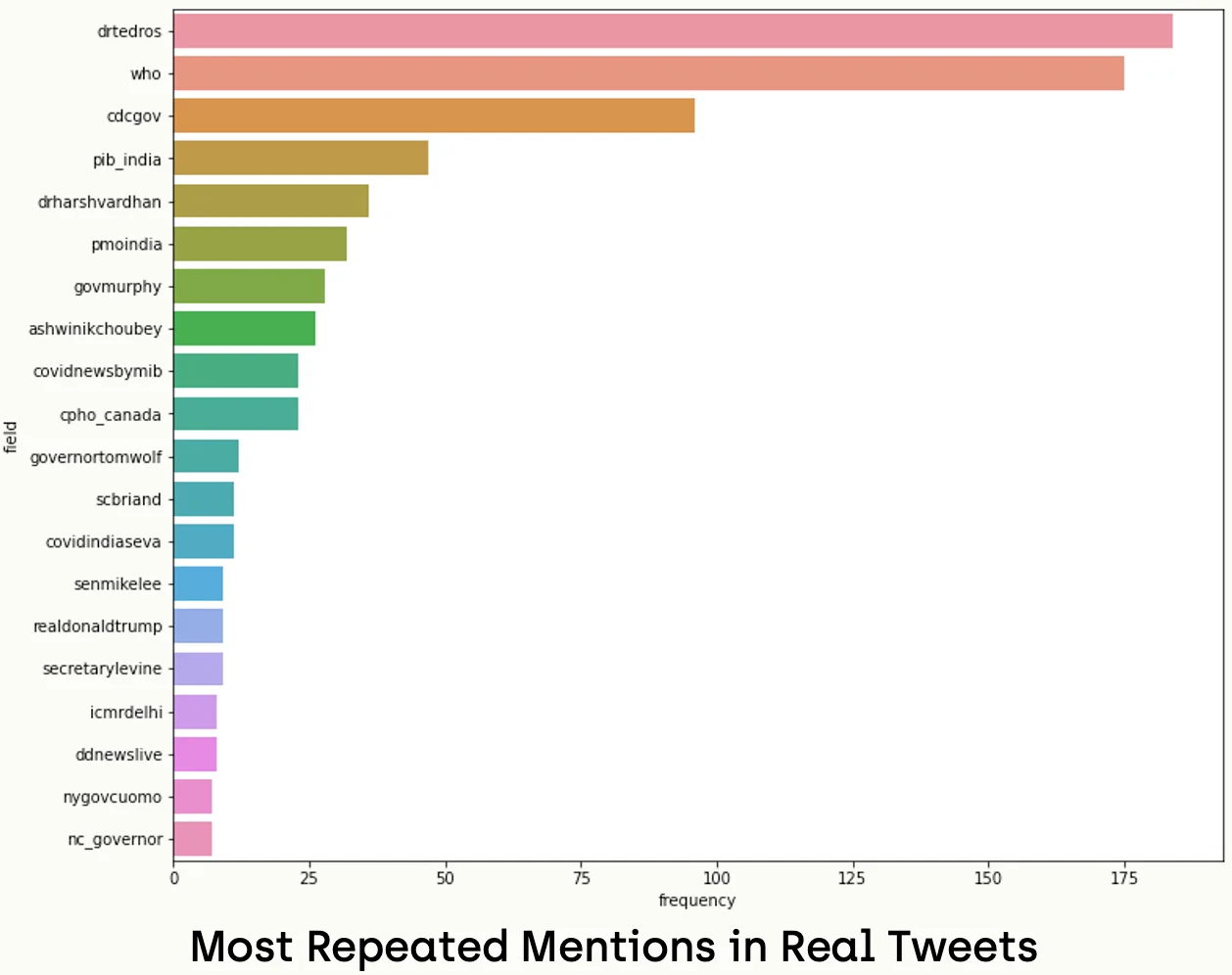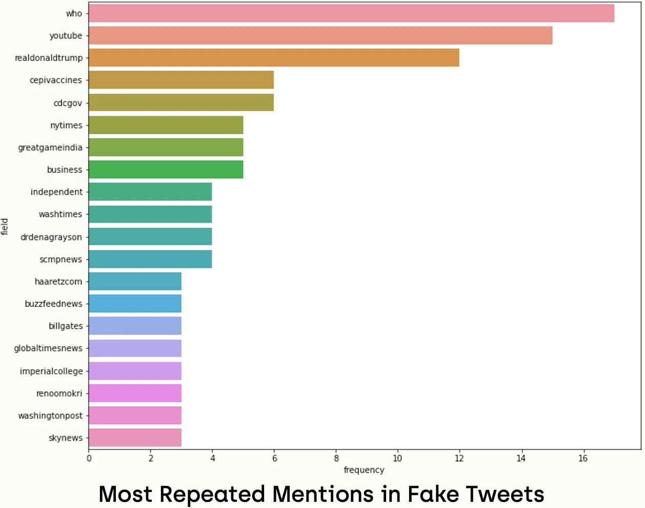 We notice that the most repeated users in real news are reliable sources, and each account has a high number of tweets, so we can say that there is an obvious dominance in this case. On the other hand, we see that even the most repeated accounts do not have a high number of accounts, so we can say that there is no dominance in the case of fake news.