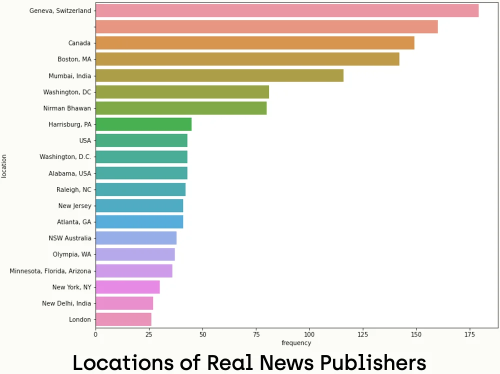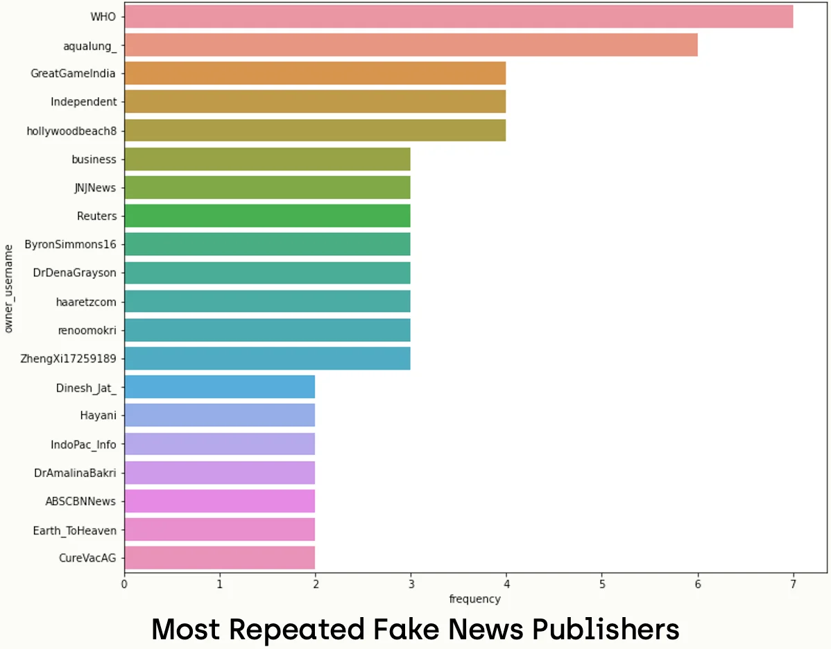 Last but not least, we will investigate the most repeated publisher among real and fake news by analyzing the owner_username field: