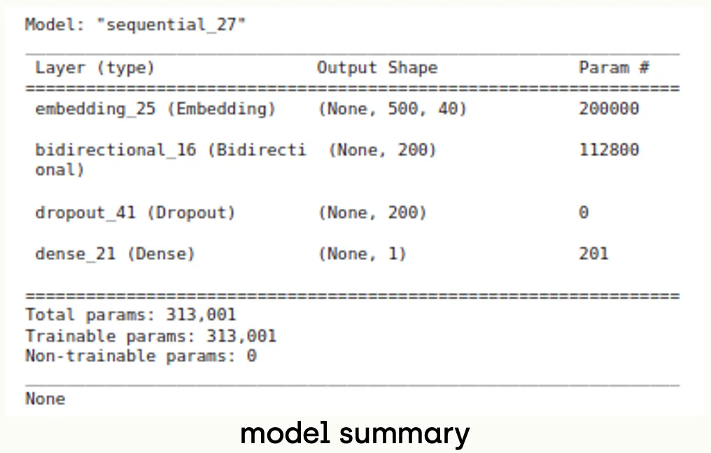 Finally, since we have prepared the data, we can build our network. In this tutorial, we will build a simple network that consists of 4 layers; 1 embedding layer, 1 bidirectional LSTM layer, 1 dropout layer, and 1 dense layer. As hyperparameters, we will use a batch size of 64, Binary Crossentropy as a loss function, and Adam as an optimizer.
