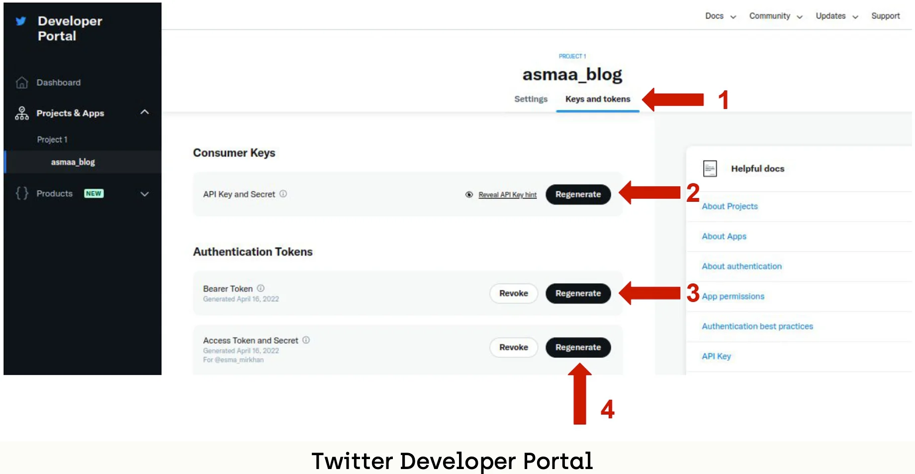 Log in to your Twitter account and go to the developer portal. Then, create a new project, and go to the dashboard. Click the buttons shown in the following image to generate the tokens and save them in a safe place: