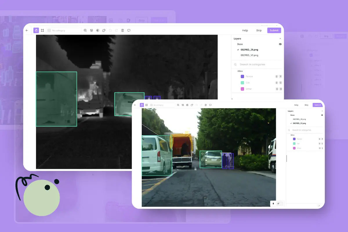 - Multilayer Annotation: Annotators can work more efficiently by focusing on one image aspect at a time. This reduces cognitive load and helps prevent errors. For example, annotators can switch between layers dedicated to specific tasks, such as separately labeling vehicles, pedestrians, and road signs in a street scene.