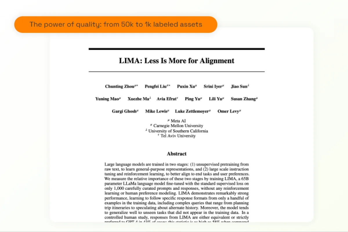 Historically, Meta has been known to focus on and invest heavily in the data quality used to train its models. Data scientists know the adage of Garbage In: Garbage Out, and Meta's researchers have provided papers to support this point further. Meta AI's LIMA paper showed that through thoughtful and strategic data curation, a model can learn from less training data without reinforcement learning or human preference modeling.