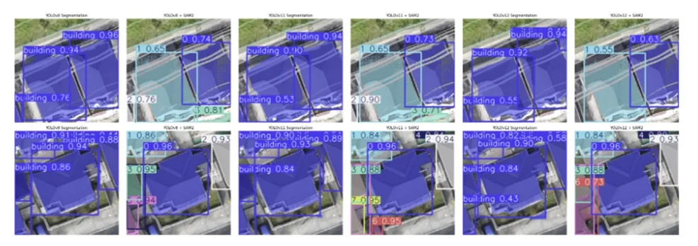 Another key insight came from pipeline design. A two-stage architecture combining detection and segmentation models proved far more effective than relying on a single model. Detection models like YOLO provided fast and reliable building localization, while segmentation models like SAM2 refined these detections into precise footprints.