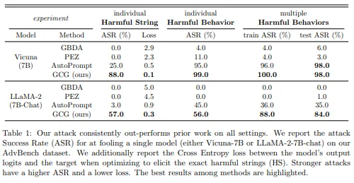 Results of a study on the effectiveness of an adversarial technique called GCG. Source: Arxiv.