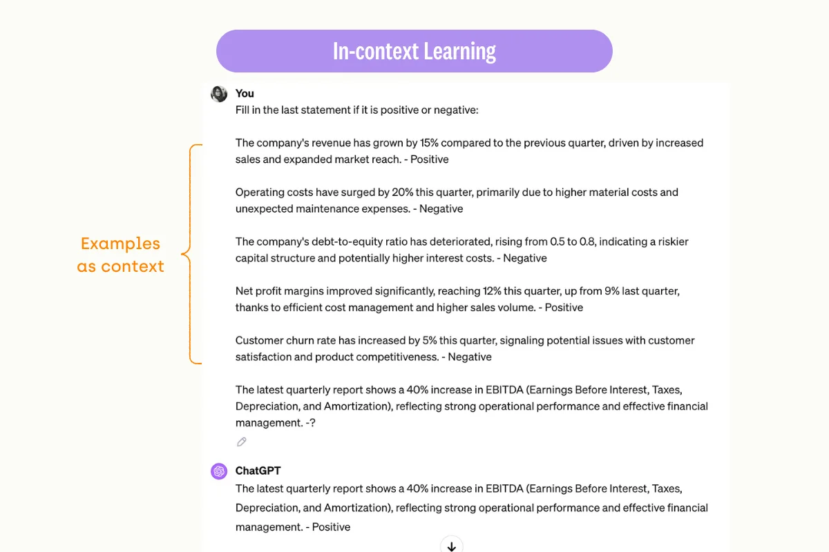 For example, when provided with a prompt and a few examples of classifications, the LLM uses these examples to guide its response to a new classification task.