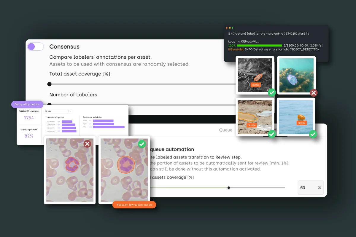 - Consensus: For simple classification tasks, the consensus metric is used to evaluate the agreement level among labelers. The platform allows setting the percentage of assets covered by consensus and the number of labelers per consensus. Results are accessible in the Explore view and Analytics page.