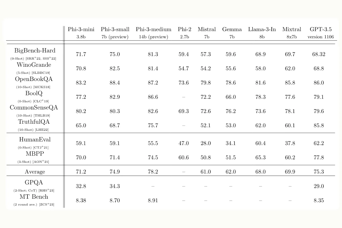 - Phi-3-mini, measuring 3.8 billion parameters, shows competitive performance across various tasks. While not always outperforming GPT-3.5, it provides a good balance for tasks where slightly lower performance is acceptable for the benefit of reduced computational requirements.