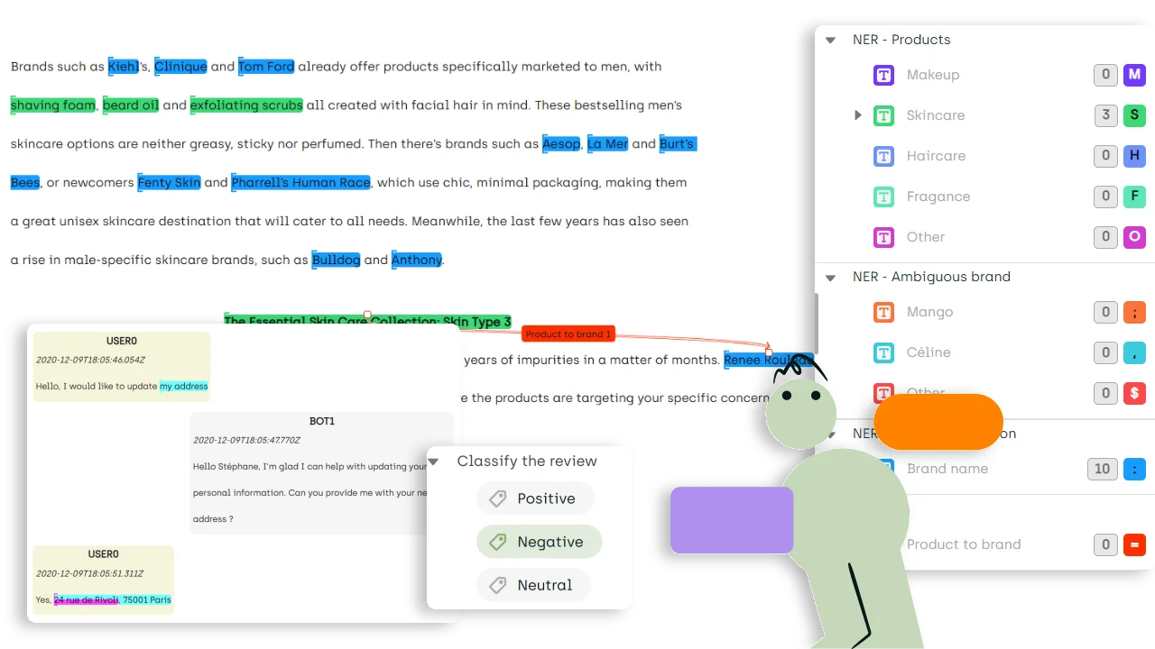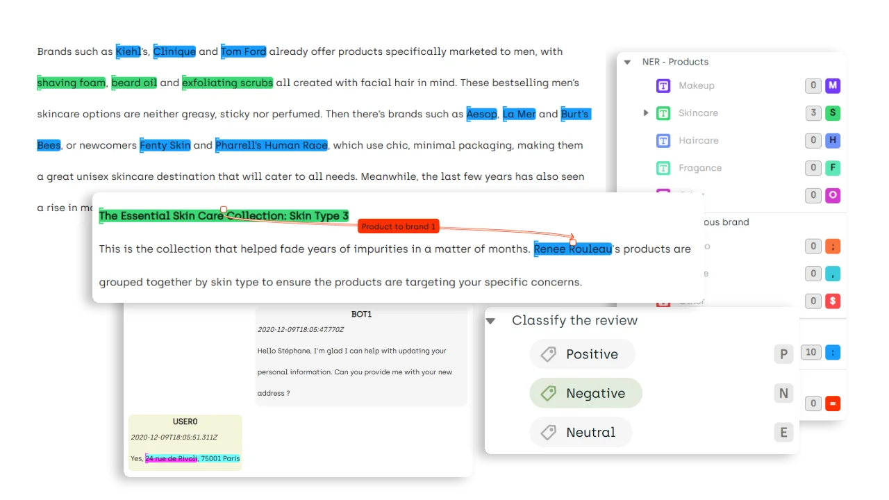 Named entity recognition with nested entities and typed relations. Sentiment analysis with custom emotion taxonomies. Multi-label text classification with hierarchical categories. Document annotation for PDFs with text extraction. Span selection for any text highlighting task. Customizable interfaces adapt to your specific requirements.